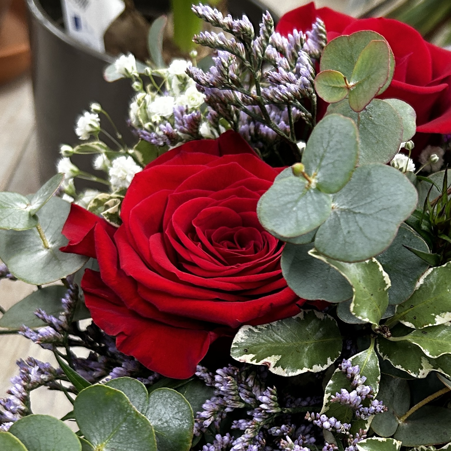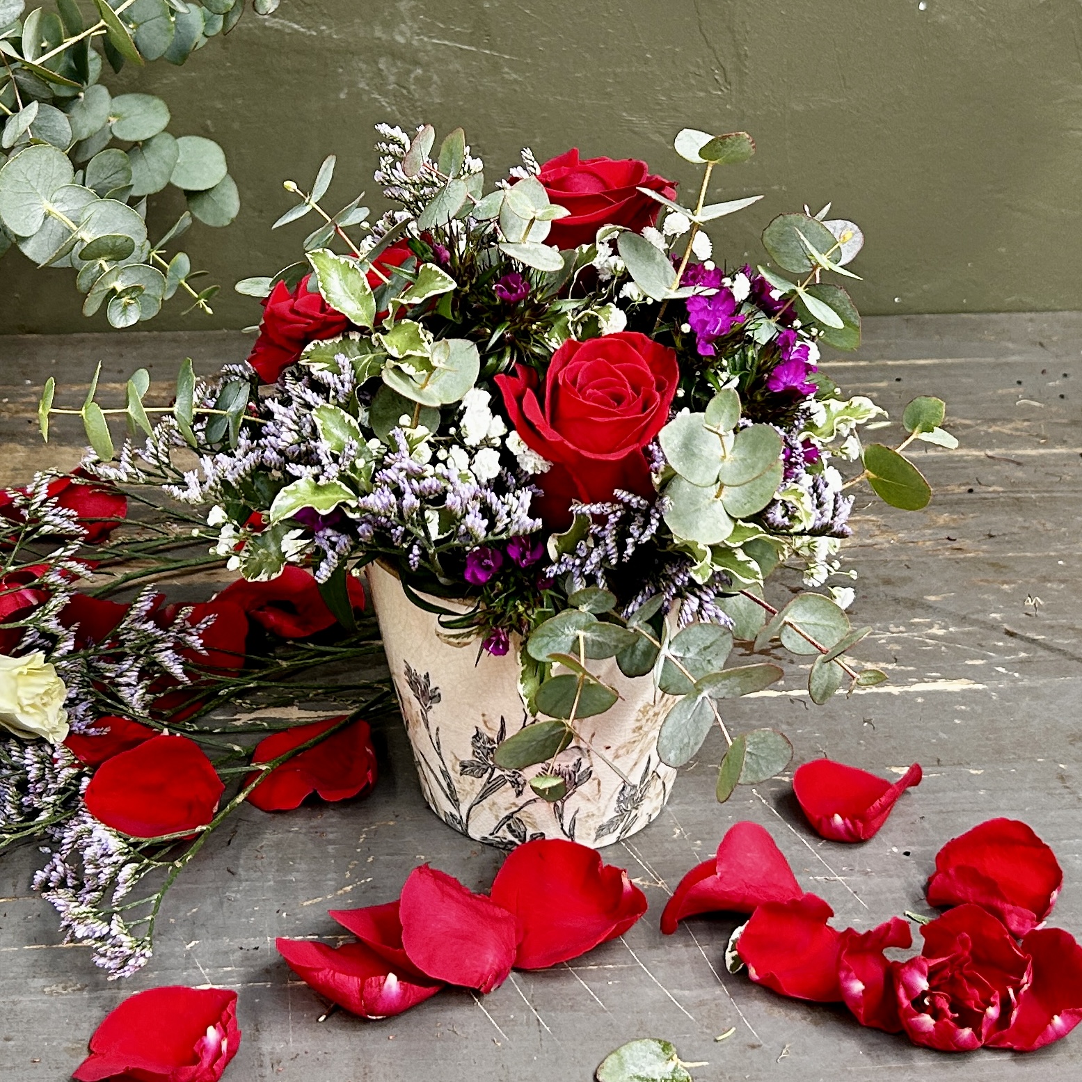 Composition florale travaillée dans un pot choisi par votre fleuriste. Rose rouge et fleurettes.